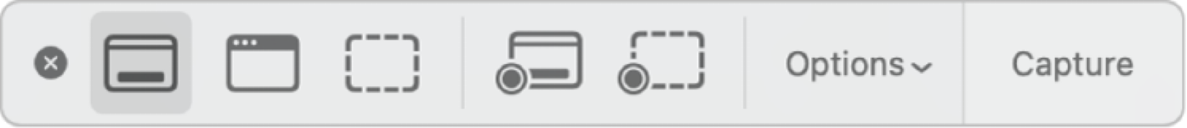 코맨드 + 시프트 + 5 번키를 동시에 누르면, 아래와 같이 "스크린캡쳐 앱 콘트롤러 박스" 가 나타난다.